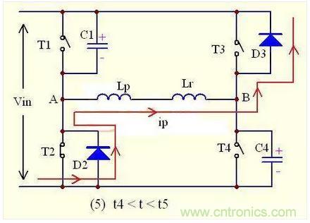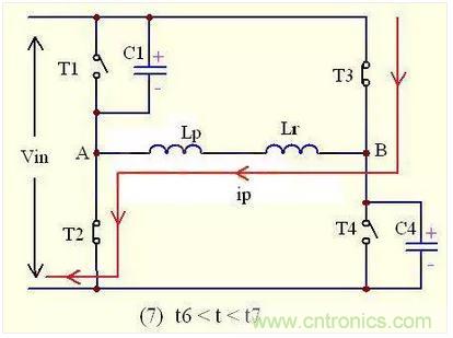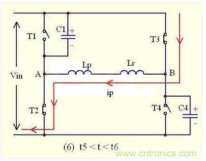 在t5-t6的時間內(nèi),副邊的二極管D1,D2還是同時導通流過電流,將副邊繞組短路,阻斷輸出電感反射到初級的途徑,此時的負載電流還是由次級電感與輸出電容提供;同時,由于原邊的T2,T3已經(jīng)導通,原邊電流ip流過T3--Lr--T2,又因為Lr很小,所以原邊電流ip就會反向急劇增大。