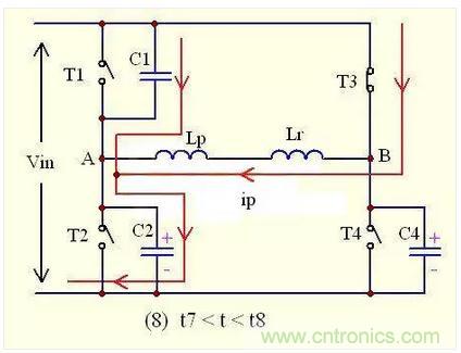 達到t6時刻之后,移相全橋的正半周期工作結(jié)束;并開始負半周期工 作,其工作原理與正半周期相似,下面來做進一步的分析:
