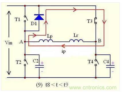 由于T3的關(guān)斷,原邊電流ip突然失去通路,但由電感的原理我們知道,原邊電流不允許突變,需要維持原來的方向,以一定的速率減少。所以,原邊電流ip會對C3充電,使C3兩端的電壓慢慢往上升,同時C4開始放電。即 ip(t)=-I2sinω(t-t9)