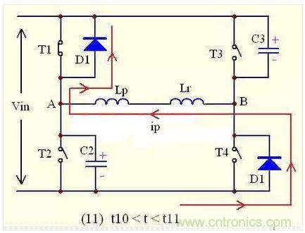 如圖所示,在t11時刻之前,T4已經(jīng)導通,在t11時刻原邊電流ip已經(jīng)上升到0,由于沒有了電流,所以D1,D4自然關(guān)斷。