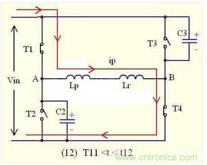 在t11-t12的時間內(nèi),副邊的二極管D1,D2還是同時導通流過電流,將副邊繞組短路,阻斷輸出電感反射到初級的途徑,此時的負載電流還是由次級電感與輸出電容提供;同時,由于原邊的T1,T4已經(jīng)導通,原邊電流ip流過T1--Lr—T4,又因為Lr很小,所以原邊電流ip就會正向急劇增大。