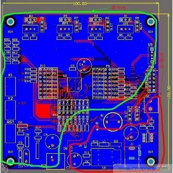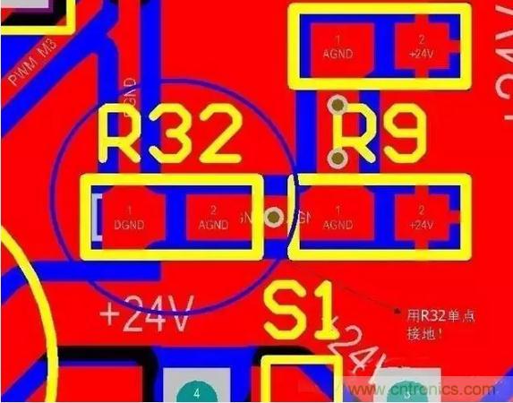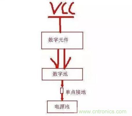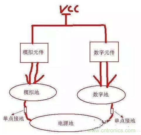 從此圖可以看出:只在電源地和數(shù)字地之間用一個0歐電阻或磁珠之類的單點接地就行了,同樣單點接地的位置應該盡量靠近板子電源地的入口(起始位置)。