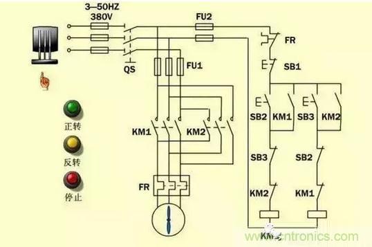星三角我上圖分析過了,控制電機(jī)正反轉(zhuǎn)也分析過了。兩圖合一就是這個(gè)圖了,喜歡的朋友可以自己學(xué)著分析一下。