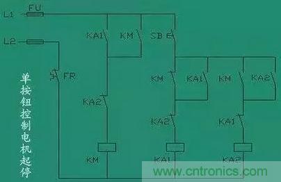 這個(gè)電路沒有太大的實(shí)用性,但是非常適合學(xué)習(xí)。2個(gè)中間繼電器和一個(gè)交流接觸器,我們看一下電路,2個(gè)繼電器互鎖,KA1的線圈串KM的輔助常閉點(diǎn),KA2的線圈串KM的輔助常開點(diǎn)。所以按下SB按鈕開關(guān)KA1自鎖,同時(shí)KA1的常開點(diǎn)閉合KM自鎖,實(shí)現(xiàn)了啟動(dòng)操作。然后再按下SB按鈕開關(guān),KA2又會(huì)自鎖,KA2的常閉點(diǎn)會(huì)斷開,而KA2的常閉點(diǎn)是串的KM的線圈,所以同時(shí)KM線圈失電,實(shí)現(xiàn)停止操作。