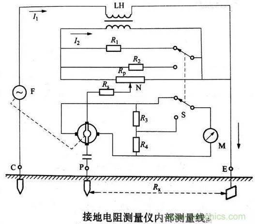 接地電阻測量儀由手搖發(fā)電機F、電流互感器LH、倍率開關(guān)S、調(diào)節(jié)電位器Rp及檢流計M等組成,全部機構(gòu)裝在塑料殼內(nèi),外有皮殼便于攜帶,附件有輔助探棒、導(dǎo)線等,其內(nèi)部測量線路如下圖所示。