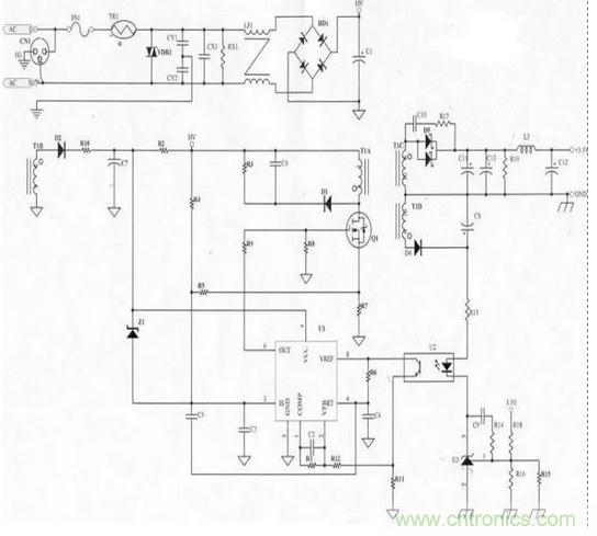 主要用于調(diào)整PWM IC的VCC電壓,以目前使用的3843而言,設(shè)計(jì)時VCC必須大于8.4V(Min. Load時),但為考慮輸出短路的情況,VCC電壓不可設(shè)計(jì)的太高,以免當(dāng)輸出短路時不保護(hù)(或輸入瓦數(shù)過大)。