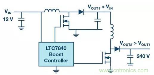 而另一個(gè)獲得較高升壓因子的方案就是使用多相 (Multi Output Phases)。以ADI公司的LTC7840芯片為例,當(dāng)中包含兩個(gè)升壓控制器。這使得實(shí)現(xiàn)兩相升壓概念變得容易。圖三顯示了電源電壓為12V的示例,輸出升壓至240V電壓。兩相升壓級將電壓分開增加,使得每級僅需要將電壓增加約4.5倍。