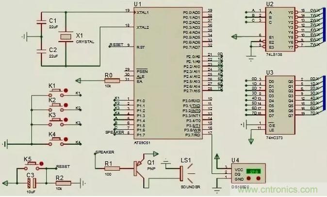 當(dāng)按1次K3進(jìn)入鬧鐘設(shè)置界面,時鐘繼續(xù)進(jìn)行走時,按K2對秒進(jìn)行設(shè)置;當(dāng)按2次K3,按K2對分進(jìn)行設(shè)置;當(dāng)按3次K3,按K2對秒進(jìn)行設(shè)置;當(dāng)按下4次K3時,鬧鐘設(shè)置完畢進(jìn)入時鐘顯示界面。電路圖如下: