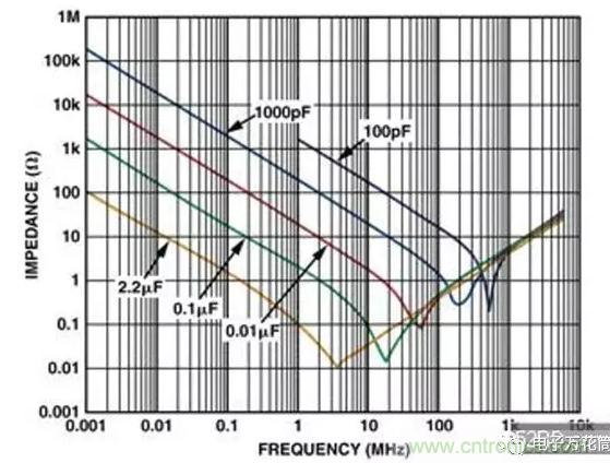 并聯(lián)不同電容值的電容器有助于確保電源引腳在很寬的頻帶上出現(xiàn)很低的交流(AC)阻抗。這對于在運算放大器電源抑制比(PSR)衰減頻率處尤其重要。該電容器有助于補償放大器降低的PSR。在許多十倍頻程范圍內(nèi)保持低阻抗的接地通路將有助于確保有害的雜訊不能進入運算放大器。(圖一)顯示採用多個并聯(lián)電容器的優(yōu)點。在低頻段,大的電容器提供低阻抗的接地通路。但是一旦頻率達到了它們自身的諧振頻率,電容器的相容性就會減弱,并且逐漸呈現(xiàn)出電感性。這就是為什么採用多個電容器是很重要的原因:當(dāng)一個電容器的頻率回應(yīng)開始下降時,另一個電容器的頻率回應(yīng)開始其作用,所以能在許多十倍頻程范圍內(nèi)保持很低的AC阻抗。
