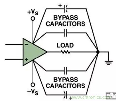 這種方法在大多數(shù)情況下都是最有效的,採用多個并聯(lián)電容器將運算放大器的電源引腳直接接地。一般說來兩個并聯(lián)電容就足夠了,但是增加并聯(lián)電容器可能給某些電路帶來益處。