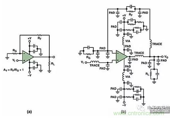 所謂寄生效應(yīng),按照字面意思就是那些出現(xiàn)在PCB板中并在電路中大施破壞、令人頭痛且原因不明的小故障。它們就是滲入高速電路中隱藏的寄生電容和寄生電感。其中包括由封裝引腳和印制線過長所形成的寄生電感;焊盤(pad)到地、焊盤到電源平面和焊盤到印制線之間形成的寄生電容;通孔之間的相互影響,以及許多其他可能的寄生效應(yīng)。(圖三)(a)顯示一個典型的同相運算放大器原理圖。但是,如果考慮寄生效應(yīng)的話,同樣的電路可能會變成圖三(b)那樣。