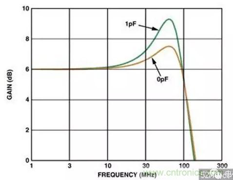 在高速電路中,很小的值就會影響電路的性能。有時候電容值幾十個pF的電容就足夠了。相關(guān)實例:如果在反相輸入端僅有1pF的附加寄生電容,它在頻率域可以引起差不多2dB的尖脈沖,如(圖四)。如果寄生電容足夠大的話,它會引起電路的不穩(wěn)定和震盪。
