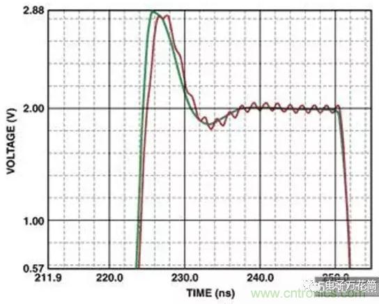 (圖七)中的震盪顯示高速運算放大器同相輸入端長度為2.54cm的印制線的影響。其等效寄生電感為29nH(10-9H),足以造成持續(xù)的低壓振蕩,會持續(xù)到整個瞬態(tài)回應(yīng)周期。圖七還顯示了如何利用接地平面來減小寄生電感的影響。
