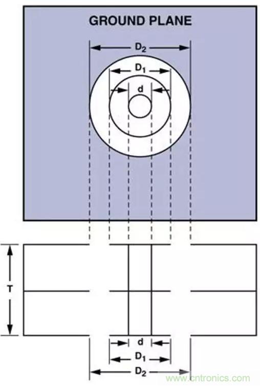 εr表示PCB材料的相對磁導(dǎo)率。T表示PCB的厚度。D1表示環(huán)繞通孔的焊盤直徑。D2表示接地平面中隔離孔的直徑。所有尺寸均以cm為單位。在一塊0.157 cm厚的PCB上一個通孔就可以增加1.2nH的寄生電感和0.5pF的寄生電容;這就是為什么在給PCB佈線時一定要時刻保持警覺的原因,要將寄生效應(yīng)的影響降至最小。