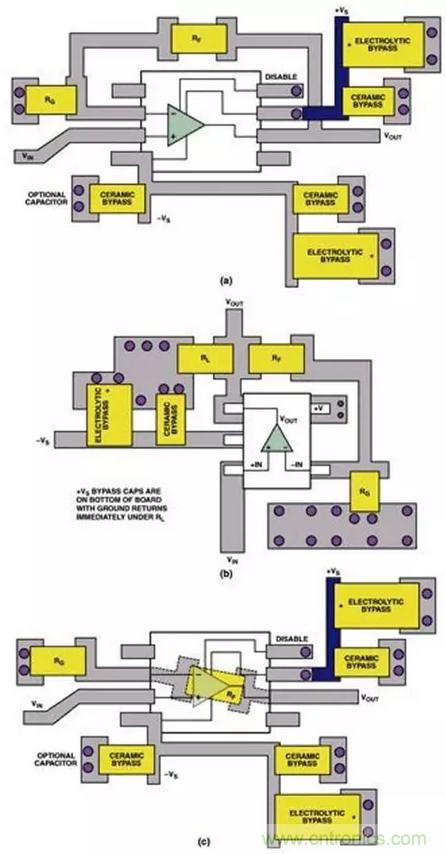 (圖九) 同一運算放大器電路的佈線區(qū)別:(a)SOIC封裝;(b)SOT-23封裝;(c)在PCB下面採用RF的SOIC封裝