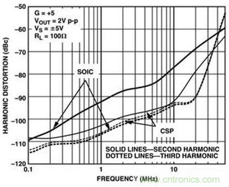 這種引腳排列還有一個好處就是降低了二次諧波失真。傳統(tǒng)運算放大器的引腳配置中引起二次諧波失真的一個原因是同相輸入和負電源引腳之間的耦合作用。LFCSP封裝的低失真引腳排列消除了這種耦合所以大大地降低了二次諧波失真;在有些情況下最多可降低14dB。(圖十二)顯示了採用SOIC封裝和LFCSP封裝失真性能的差別。
