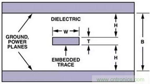 帶狀控制阻抗印制線(圖十四)採用了兩層接地平面,信號印制線夾在其中。這種方法使用了較多的印制線,需要的PCB層數(shù)更多,對電介質(zhì)厚度變化敏感,而且成本更高,所以通常只用于要求嚴(yán)格的應(yīng)用中。