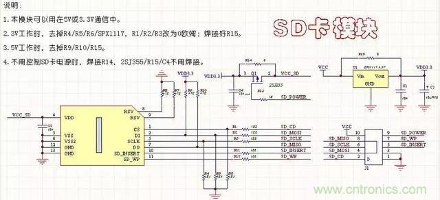 6、SD卡模塊電路(帶鎖)本電路與SD卡的封裝有關(guān),注意與封裝對(duì)應(yīng)。此電路可以通過(guò)端口控制SD卡的電源,比較完善,可以用于5V和3.3V。但是要注意,有些器件的使用,5V和3.3是不一樣的。