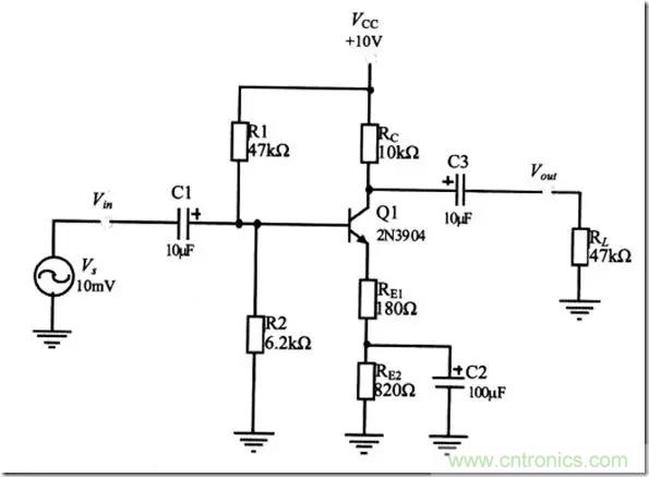 上圖是基極分壓式共射極放大電路,更為常用的電路圖如下圖所示:(圖中各參數(shù)值可以不用理會(huì),僅作說明)