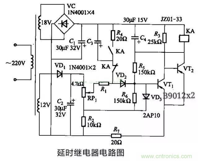 它工作使用一微型變壓器降壓,初級輸入電源為AC交流220Ⅴ,次級有二組電源AC18Ⅴ AC12Ⅴ,AC18V經(jīng)橋式整流二極管(1N4001×4),C1(30uf/32V)濾波后,為kA微型繼電器、復(fù)合三極管ⅤT1 ⅤT2(9012)提供直流DC工作電源。另一組AC交流12Ⅴ電經(jīng)vD1半波整流,C2電解電容濾波,供給調(diào)整充電時間專用可變電位器RP1,C3為一獨石電容,其工作特性較好而用于延時充放電電路中。圖中有JZ01一33繼電器的kA常開和一組kA常閉觸頭,它們在電路中主要作用就是上面給大家說的,通電、斷電延時繼電器在完成預(yù)置時間后恢復(fù)原始狀態(tài),進(jìn)行下一步工作做好準(zhǔn)備。