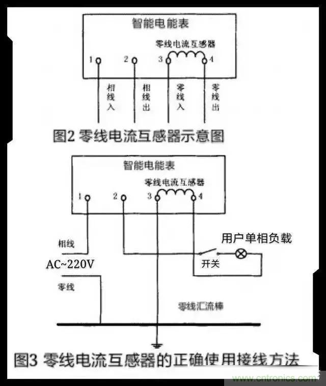 這種智能計量裝置采用微處理器和專門用于電能計量的芯片。它具有功能完善、計量精度高等等特點。而對于單相220V的用電用戶來說,現(xiàn)在的智能電能表在其內(nèi)部結(jié)構(gòu)中都已經(jīng)安裝了“零線電流互感器”。為了提高智能電能表的技術(shù)防護(hù)能力,在電源進(jìn)、出相線短接的情況下,它能夠檢測流過電能表的零線回路中的電流。而且國家電網(wǎng)在技術(shù)規(guī)范要求中明確提出,所有的智能電能表都必須安裝有零線電流互感器測量、記錄的功能。請看下圖所示