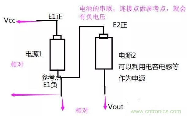 想產(chǎn)生負(fù)電壓,就讓他相對于電源負(fù)極的電勢更低即可。要想更低,必須有另一個電源的介入,根本原理都是利用兩個電源的串聯(lián)。電源2正極串聯(lián)在參考電源1的負(fù)極后。電源2負(fù)極就是負(fù)電壓了。
