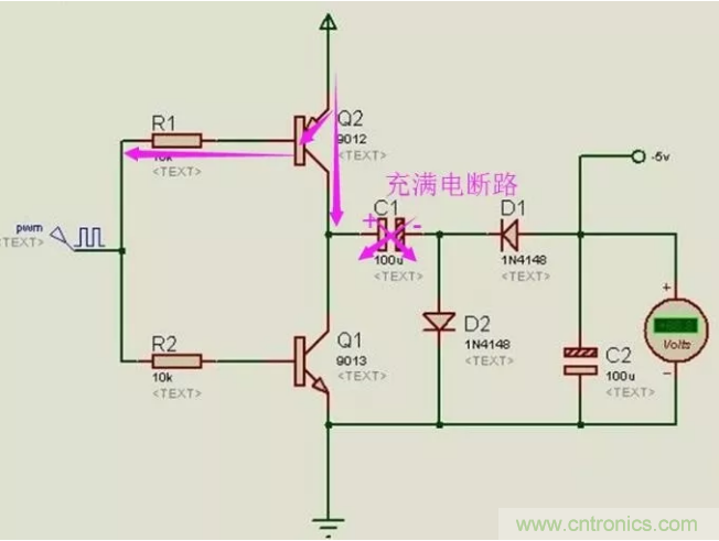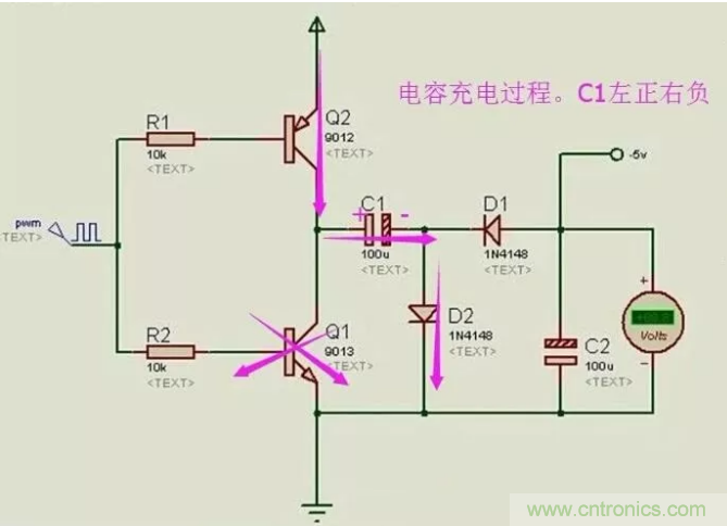 當(dāng)PWM為低電平時,Q2關(guān)閉,Q1打開,C1開始放電,放電回路是C1-C2-D1,這實際上也是對C2進行充電的過程。C2充好電后,下正上負(fù),如果VCC的電勢為5點幾伏,就可以輸出-5V的電壓了。