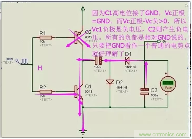 3、電容C1作為電源,C1高電勢極串聯(lián)在參考點。C1放電,從C2續(xù)流,產(chǎn)生負(fù)電壓。