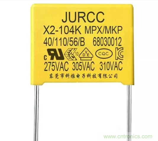 X電容是跨接在電力線兩線之間,即“L-N”之間,X電容器能夠抑制差模干擾,通常采取金屬化薄膜電容器,電容容量是uF級。X電容多數(shù)是方型,也就是類似于盒子的形狀,在它的表面一般都標(biāo)有安全認(rèn)證標(biāo)志、耐壓字樣(一般有AC300V或AC275V)、依靠標(biāo)準(zhǔn)等信息。X電容雖然是CBB電容的一種,但是并不是每一種CBB電容就能做X電容必須要達(dá)到安規(guī)標(biāo)準(zhǔn)。
