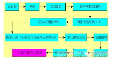用大俗話來說,找一塊有用的芯片,照照相、制制版、提提圖、畫畫圖、仿仿真,芯片電路就反求了出來;編編工藝、設(shè)計工裝、將生產(chǎn)線開動,芯片又做了出來;再做做測試、進(jìn)行老化,芯片就可以上市了。這就是集成電路反向開發(fā)的各道工序、完整流程。下面這張圖就說明了全過程。