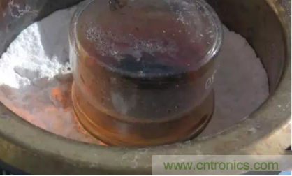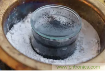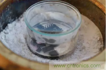 首先把要拆解的芯片放置在裝了濃硫酸的容器里,容器需要蓋住,但不能嚴(yán)實,這樣里面的氣體才能漫溢出來。把容器里的濃硫酸加熱到沸騰(大約 300 攝氏度),在瓶底的周圍鋪上蘇打粉——用來預(yù)防意外飛濺出來的硫酸液和冒出來的硫酸氣體。