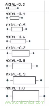 可以選用“RES1”、“RES2”、“RES3”、“RES4”中任何一個,對應(yīng)的電阻封裝為AXIAL系列,比如“AXIAL-0.3”到“AXIAL-0.7”,其中0.4和0.7指電阻封裝的焊盤間距,一般用“AXIAL0.4”封裝。