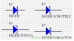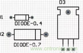 二極管的原理圖符號為“DIODE”,對應(yīng)的二極管的封裝為封裝屬性系列,如“DIODE-0.4”(小功率)到“DIODE-0.7”(大功率),其中0.4和0.7指二極管的焊盤間距,一般用“DIODE0.4”。值得一提的是,普通的發(fā)光二極管的元器件封裝為“RB.1/.2”。
