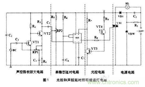 但從多年從事電子技術(shù)教學(xué)的經(jīng)驗中,我覺得識讀電子電路原理圖還是有一定方法可以遵循的,下面分享一些結(jié)合光控和聲控延時照明樓道燈電路(圖1)做的總結(jié)。