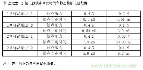MIL-R-39016D和GJB 65A-91對觸點回跳做了定義:“等于或大于開路電壓的 90%,且脈沖寬度等于或大于 10 uS 的現(xiàn)象則認為是回跳”。同時明確規(guī)定觸點回跳時間不得超過 1.5 mS。有些用戶對回跳時間參數(shù)不以為然,認為觸點最終總會接通(或斷開),過程中有沒有回跳不影響繼電器的正常使用。這是一種錯誤的認識,軍標之所以規(guī)定回跳時間參數(shù)的測試,是因為繼電器的回跳時間同靜態(tài)接觸電阻參數(shù)一樣,反映了繼電器的觸點壓力,試驗證明,當繼電器的觸點壓力明顯衰退時,回跳時間會變長。表3顯示了繼電器樣品在試驗中觸點回跳時間和觸點壓力之間的關(guān)系。
