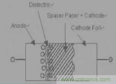 4. 陰極箔( Cathode Foil ):連接電解液和外部的層,這層在制作中并不需要氧化,但是在實(shí)際中由于在蝕刻過程中鋁容易被氧化,所以其形成了一個(gè)自然被氧化的氧化層,這個(gè)氧化層可以承受 1~2v 的電壓。