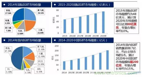 2015年國(guó)際IGBT市場(chǎng)規(guī)模約為48億美元,預(yù)計(jì)到2020年市場(chǎng)規(guī)??梢赃_(dá)到80億美元,年復(fù)合增長(zhǎng)率約10%。2014年國(guó)內(nèi)IGBT銷售額是88.7億元,約占全球市場(chǎng)的1∕3。預(yù)計(jì)2020年中國(guó)IGBT市場(chǎng)規(guī)模將超200億元,年復(fù)合增長(zhǎng)率約為15%。