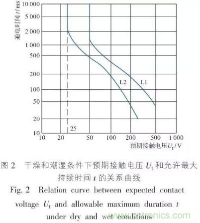 當(dāng)電流Ib通過人體阻抗為Zs時,會產(chǎn)生電壓Ut,電壓Ut稱為接觸電壓,電流Ib是接觸電流,Ib越大,接觸電壓Ut也越大。實際工作時,計算Ib較困難,而計算接觸電壓比較方便,于是IEC又提出在干燥和潮濕環(huán)境條件下相應(yīng)的預(yù)期接觸電壓Ut―通電時間t的曲線L1和L2(如圖2所示),這里預(yù)期的接觸電壓是最大的接觸電壓,為確保電氣安全和簡化計算,在實際應(yīng)用中,接觸電壓都采用預(yù)期接觸電壓。