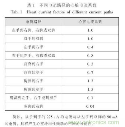 以上所述電擊電流通過人體的通道環(huán)境是在地面上,接觸電流經(jīng)手、腳和不同電位導(dǎo)體接觸,有可能經(jīng)心臟引發(fā)電擊事故。表1是不同電流路徑的心臟電流系數(shù),引自GB / T 13870. 1 - 2008 / IEC / TS 60479 - 1:2005《電流對人和家畜的效應(yīng) 第1部分:通用部分》表12。