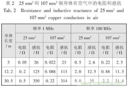 表2是電阻及電抗隨工作頻率變化而變化的關(guān)系。由表2可知:對于同一截面(如25 mm2)的銅導(dǎo)體在高頻1 MHz時,其感抗量為電阻量的625倍;頻率為100 MHz時,兩者的倍數(shù)高達6 250。當(dāng)導(dǎo)體截面增大為107 mm2、頻率為1 MHz時,其感抗量為電阻量的1 284倍;頻率為100 MHz時,兩者的倍數(shù)高達12 840。