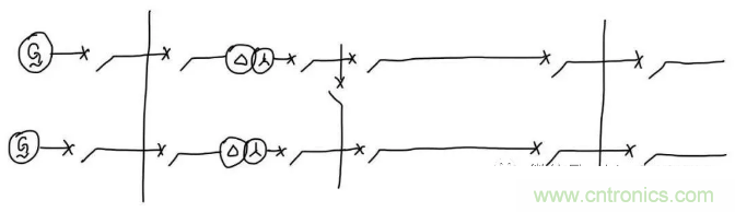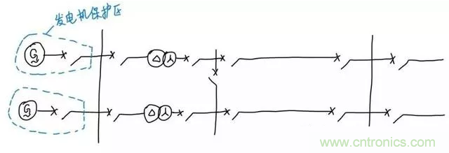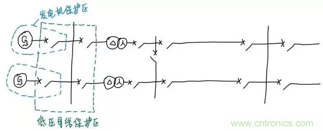 我們繼續(xù)往后看。可以看到發(fā)電機(jī)接到了低壓母線,對于這個低壓母線的保護(hù)來說,要做到故障時只停母線而不停其它設(shè)備,只要讓保護(hù)在故障時切除和母線直接連接的四個斷路器就可以了。所以四個斷路器旁邊的電流互感器圍成的范圍就是這條母線保護(hù)的保護(hù)范圍。