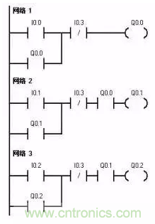 2. 單向順序停止控制電路就是要求按一定順序停止已經(jīng)執(zhí)行的各機構(gòu)。只有Q0.2被停止后才可以停止Q0.1,若想停止Q0.0,則必須先停止Q0.1。I0.4為急停按鈕。