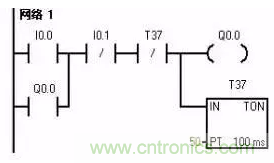 3.延時啟停控制電路該電路要求有輸入信號后,停一段時間輸出信號才為ON;而輸入信號0FF后,輸出信號延時一段時間才OFF。T37延時3 s作為Q0.0的啟動條件,T38延時5 s作為Q0.0的關(guān)斷條件。