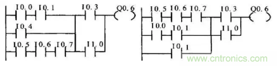 (3)幾個串聯(lián)支路相并聯(lián),應將觸點多的支路安排在上面;幾個并聯(lián)回路的串聯(lián),應將并聯(lián)支路數(shù)多的安排在左面。按此規(guī)則編制的梯形圖可減少用戶程序步數(shù),縮短程序掃描時間。