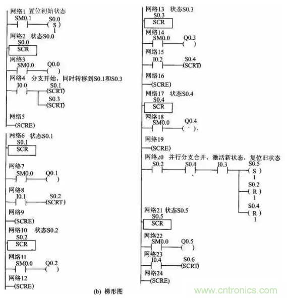 (6)在狀態(tài)發(fā)生轉(zhuǎn)移后,所有的SCR段的元器件一般也要復位。如果希望繼續(xù)輸出,可使用置位/復位指令。