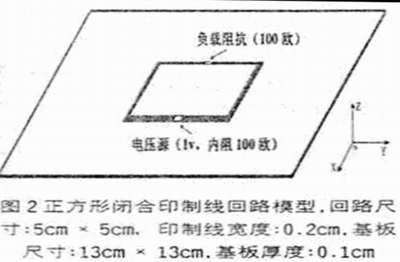 這是一種帶有接地平面的正方形的閉合印制線(xiàn)環(huán)路,在回路的兩端分別接有電壓源和阻抗相等的源內(nèi)阻、負(fù)載,當(dāng)電壓信號(hào)的頻率較高時(shí),這種結(jié)構(gòu)與方環(huán)形天線(xiàn)是非常相似的,成為一種嚴(yán)重的輻射源。