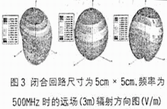 對(duì)于建立好的模型.可以通過(guò)電磁場(chǎng)的數(shù)值模擬軟件來(lái)對(duì)其輻射特性進(jìn)行分析。在這里我們使用Ansoft的HFSS(High Frequency Structure Simulator)來(lái)進(jìn)行模擬。首先來(lái)研究這種閉合印制線(xiàn)回路的面積發(fā)生變化時(shí)其輻射特性如何發(fā)生變化。當(dāng)差模輻射用小環(huán)天線(xiàn)產(chǎn)生的輻射來(lái)模擬時(shí),在距離輻射回路為的遠(yuǎn)場(chǎng)的電場(chǎng)強(qiáng)度為E=131.6 ×106(fSI)(1/r)Sinθ(1)其中f(H2)為回路中電流信號(hào)的頻率,S(m2)為回路面積,1(A)為電流強(qiáng)度,θ(0)為測(cè)量天線(xiàn)與輻射平面的夾角。我們根據(jù)圖1所示的結(jié)構(gòu),取正方形閉合回路的邊長(zhǎng)分別為3cm、4cm、5cm、6cm和7cm進(jìn)行模擬,信號(hào)頻率為500MHz。圖3(a)和圖4分別為模擬得到的差模電流輻射的遠(yuǎn)場(chǎng)三維方向圖(由于閉合回路的邊長(zhǎng)變化時(shí)其遠(yuǎn)場(chǎng)方向圖是非常相似的,此處只給出邊長(zhǎng)為5cm時(shí)的方向圖)和S-E曲線(xiàn),從中可以很明顯出由于印制線(xiàn)路板接地平面的存在使得差模輻射功率主要集中在接地平面上方,同時(shí),遠(yuǎn)區(qū)輻射場(chǎng)的電場(chǎng)強(qiáng)度與回路面積呈線(xiàn)性變化關(guān)系(本文中的電場(chǎng)強(qiáng)度均指在閉合印制線(xiàn)回路最大輻射方向上的電場(chǎng)強(qiáng)度),這與式(1)是完全符合的。