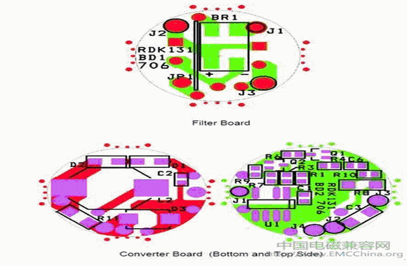 雖然該設(shè)計(jì)具有功能性,但仍存在傳導(dǎo)輻射問(wèn)題。由于兩個(gè)PCB比較接近,開(kāi)關(guān)電流會(huì)從轉(zhuǎn)換器電路板耦合到EMI濾波器電路板,從而降低EMI濾波器的性能。通過(guò)在這兩個(gè)電路板之間放置“屏蔽”PCB,這一問(wèn)題便得以解決。而第三個(gè)電路板只是一層銅,并無(wú)電路。它被電氣連接到EMI濾波器負(fù)輸出端與轉(zhuǎn)換器負(fù)輸入端的接合處。這樣,總裝便由三個(gè)疊加在一起的圓形電路板組成。增加第三個(gè)電路板既簡(jiǎn)單又節(jié)省成本,不但解決了耦合問(wèn)題,還達(dá)到了EMI性能要求。