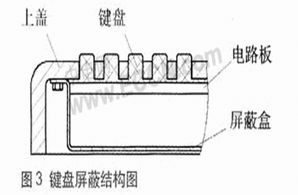 本終端鍵盤采用硅橡膠專用鍵盤,安裝在上蓋表面,開口較多,易引起電磁泄漏,降低屏蔽效能。因?yàn)榭卓p對(duì)電磁波的衰減與干擾波波長(zhǎng)及孔縫尺寸有關(guān),一般應(yīng)使孔洞的尺寸遠(yuǎn)小于電磁波的波長(zhǎng),只要孔縫的直徑足夠小,就能夠達(dá)到所要求的屏蔽效能。但一般按鍵的大小、排列應(yīng)符合人們的操作習(xí)慣,按鍵太小使用不方便,故這里主要采取安裝屏蔽罩的方法來減少電磁泄漏。鍵盤的屏蔽結(jié)構(gòu)設(shè)計(jì)如圖3所示。