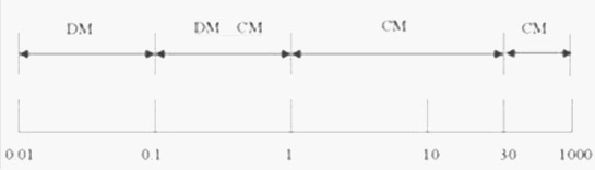 由于DC-DC轉(zhuǎn)換器的工作頻率基本都在幾百KHz,根據(jù)以往各型號(hào)產(chǎn)品的EMC檢測(cè)試驗(yàn)經(jīng)驗(yàn),一般情況下DC-DC轉(zhuǎn)換器的EMI超標(biāo)頻段都會(huì)覆蓋0.1_1MHz頻段的一部分或全部范圍。根據(jù)圖1所示的分布原理,我們通常要采取有重點(diǎn)地對(duì)CM和DM同時(shí)抑制的原則。